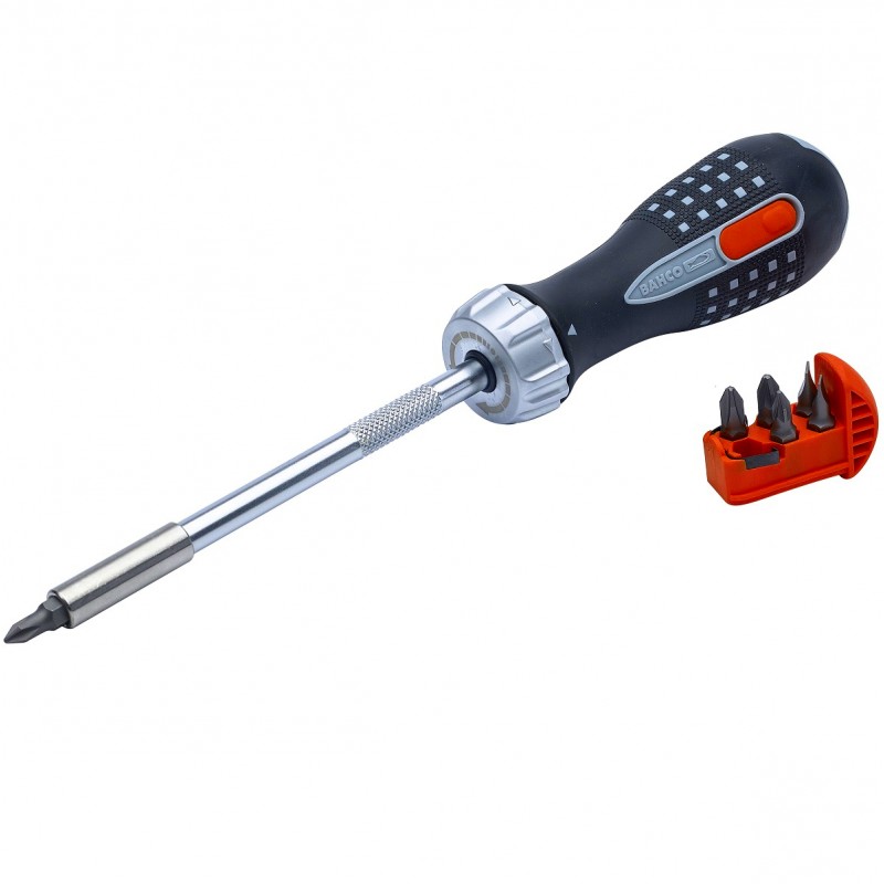 The Bahco 808050 Ratchet Screwdriver is a 1/4 inch ratcheting bit holder screwdriver with a magnetic bit holder.