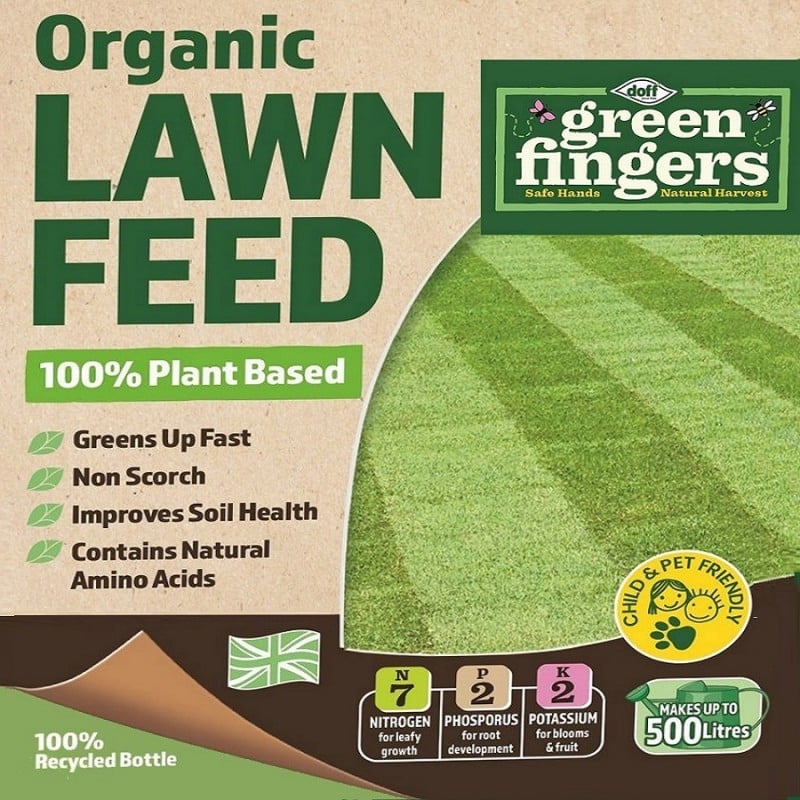 Green Fingers Premium Quality balanced grass lawn feed thats derived from cane sugar a sustainable plant product and is formulated in a ratio specifically designed to fertilise lawn grass and will help maintain a healthy, green and lush looking lawn.