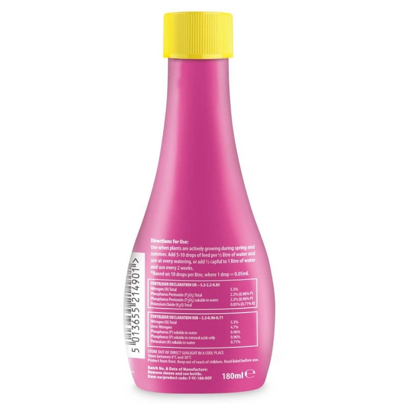 Add 5-10 drops of feed per half litre of water and use at every watering or add half a cap to 1 litre of clean water and use every 2 weeks.