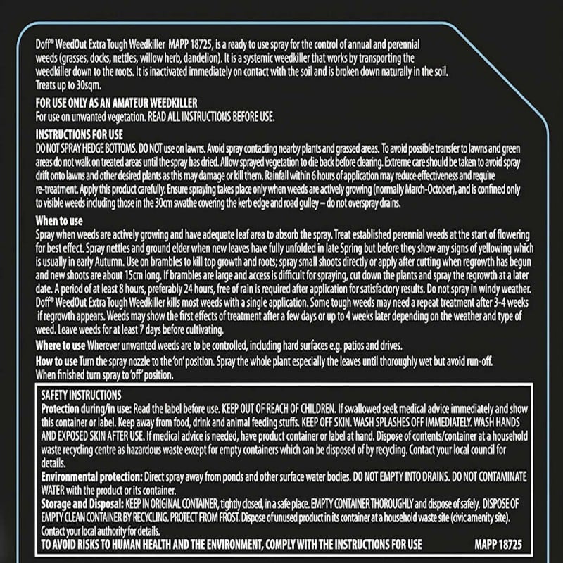 Doff Weedout Extra Tough Weed killer is a ready to use spray on weed killer for the control of annual and perennial weeds
