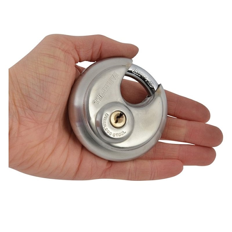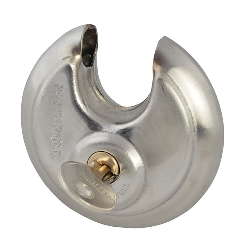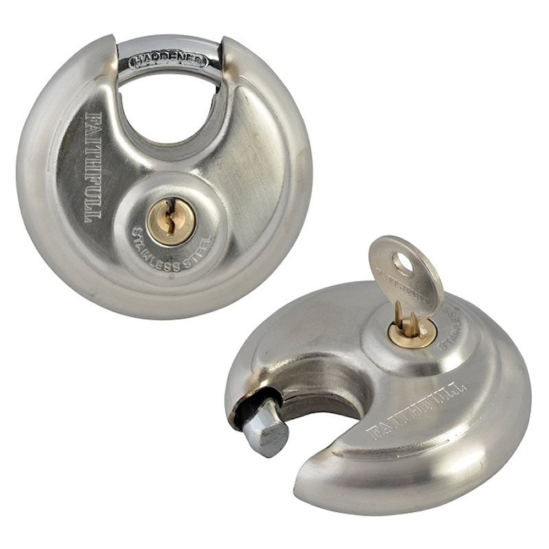 The Faithfull Discus Padlock has a waterproof, anti-corrosion stainless body and a hardened steel shackle.