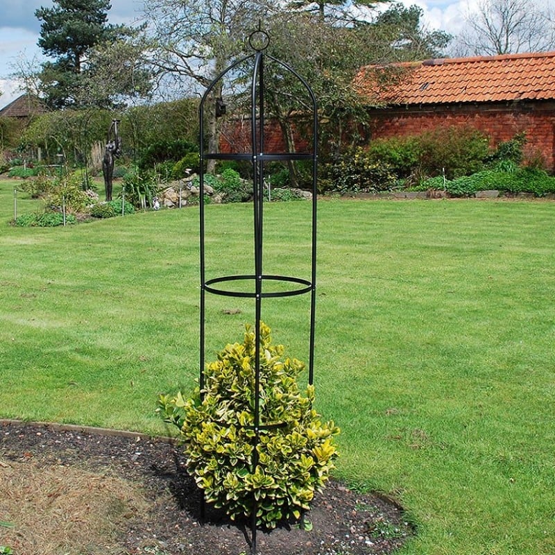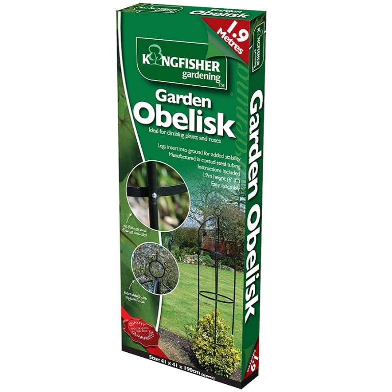 The kingfisher 1.9 meter tall obelisk is made from lightweight but strong metal tube and flat steel constructed for garden plant support