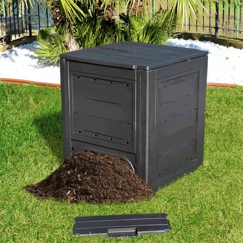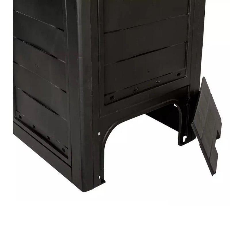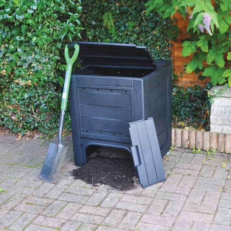 This composter box is made from sturdy black weatherproof plastic and features twin opening hinged lid to deposit the garden waste products it has a sliding removable front lower door panel for access by shovel to the finished compost.