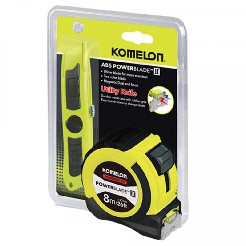 Komelon PowerBlade ll Hi-Vis 8m Tape Measure and Retractable Utility Knife Twin Pack