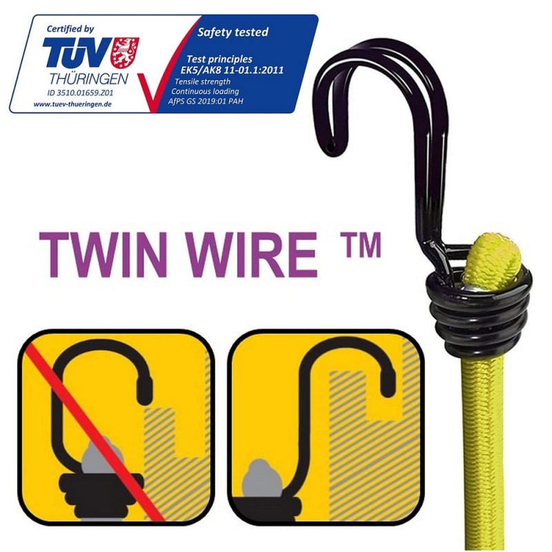 The reverse twin wire hook offers twice the strength of an ordinary bungee and the rounded hook eliminates the risk of scratching, the reverse hook bends away allowing more room to attach.