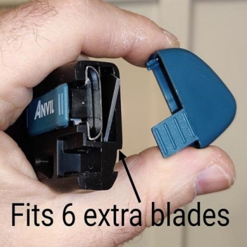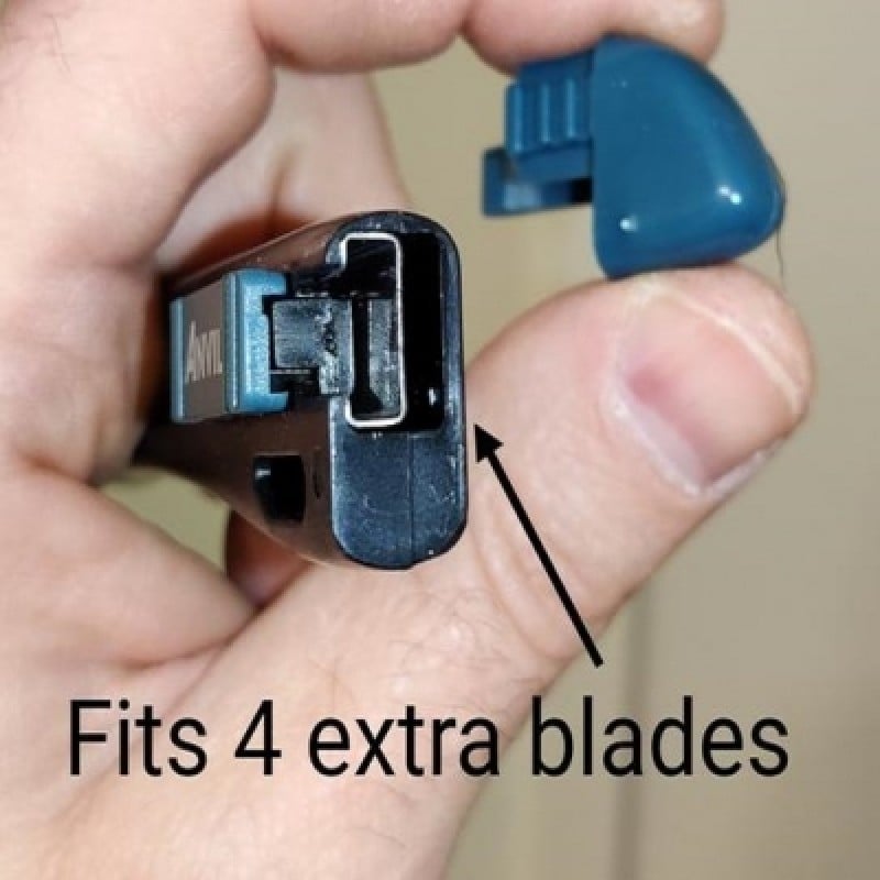 End of handle un-clips for a quick and easy blade change also gains access to extra blade storage.